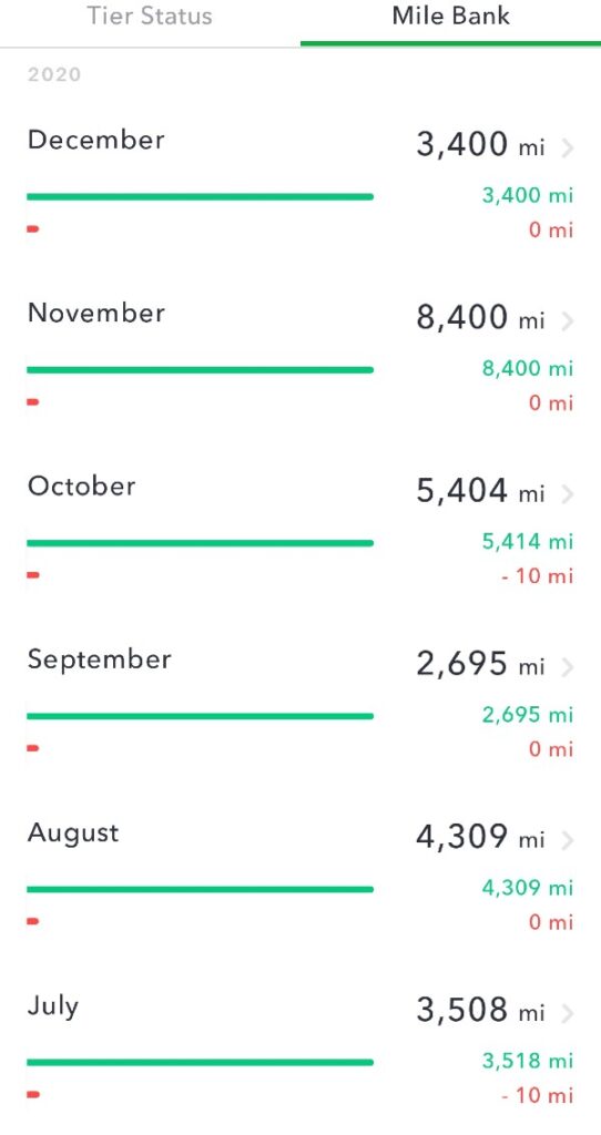 My mom passed away in September and we drove from Southern California to Eastern Pennsylvania in mid September, driving back in mid October. Compared to November, when I stayed home most of the month yet earned more than the other two months combined. The miles earned don’t seem to particularly reflect that.